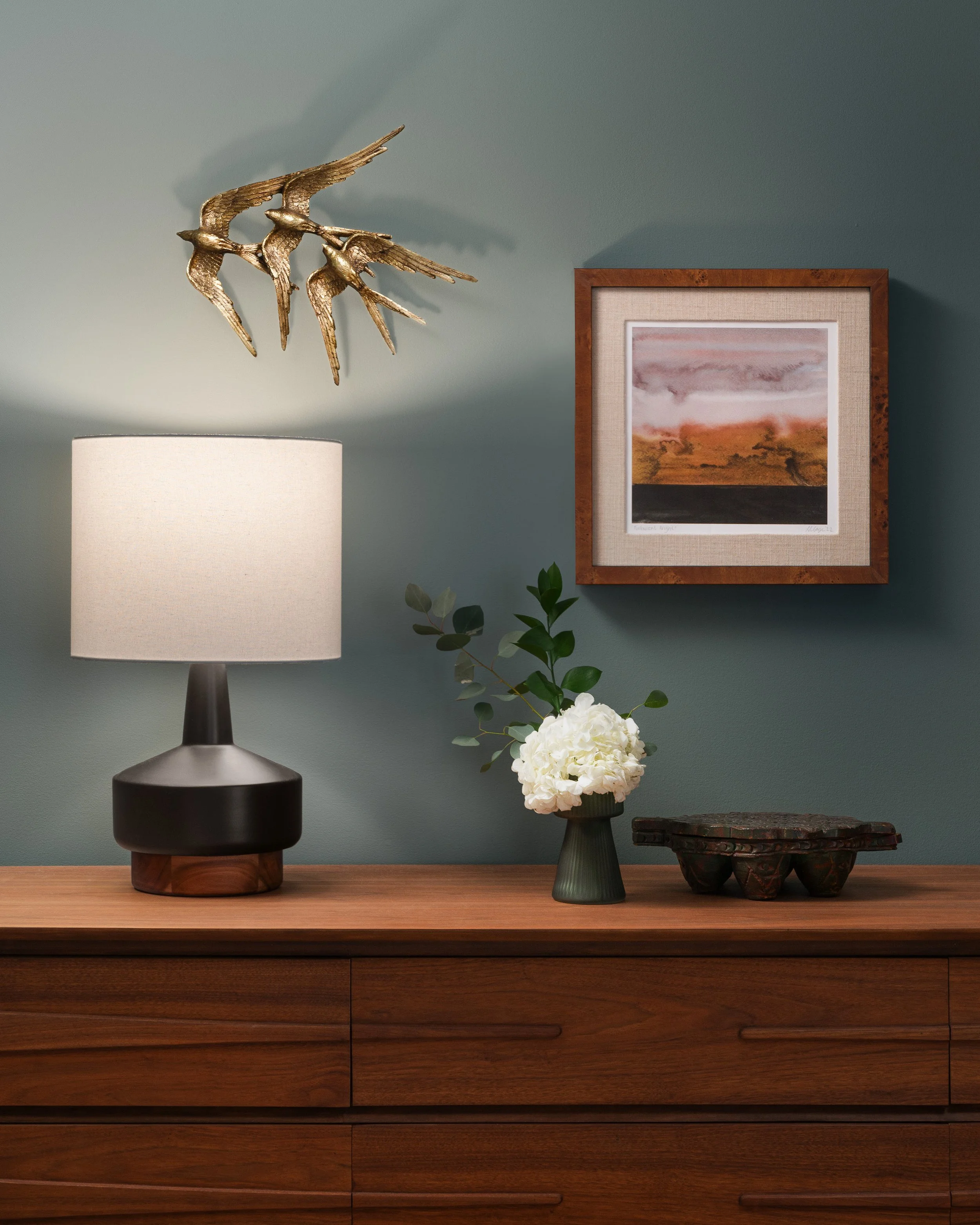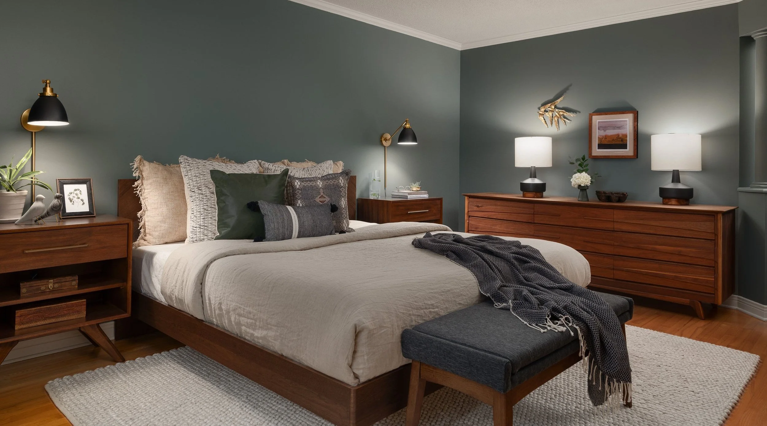 Taking inspiration from the clients’ existing walnut dresser, we curated a selection of furnishings—bed, nightstands, and a bench—that not only echoed the Mid-Century ethos but also appeared as though they were original to the home. The rich warmth of the walnut pieces, combined with the luminous allure of brass accents and strategically placed artworks, creates a cohesive sanctuary. Balanced by hints of black and enhanced with plush textiles, the space now offers our clients a cozy cocoon away from the chaos of everyday life.